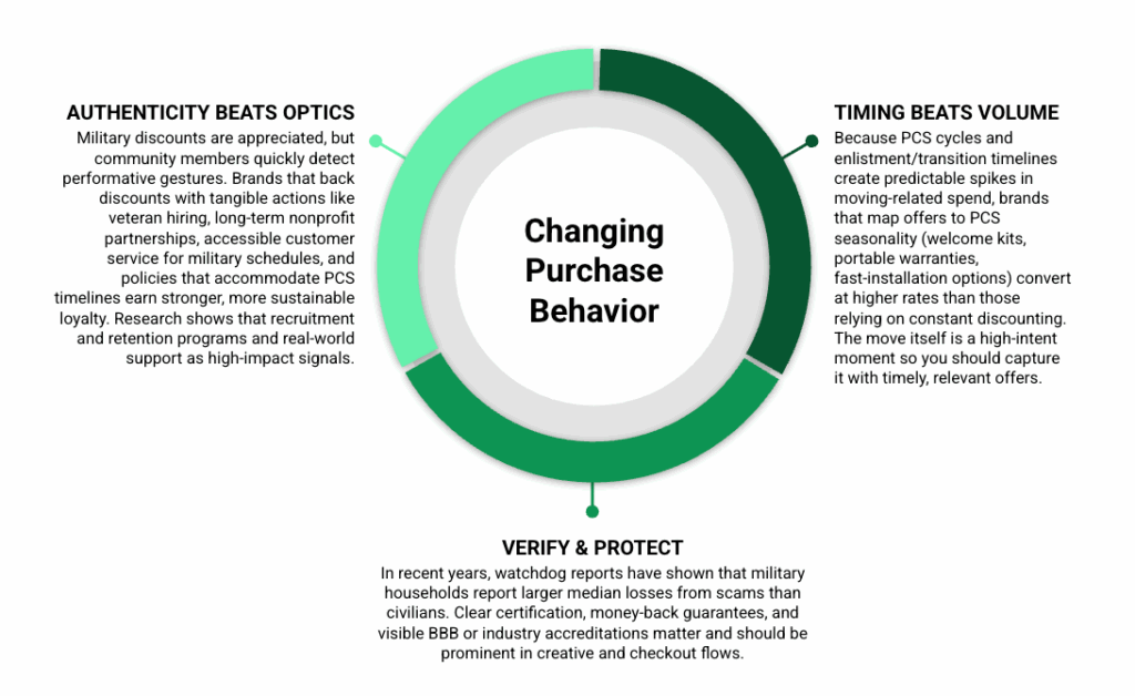 Mobility is Baked into the Lifestyle. More than 400,000 service members move through permanent change of station (PCS) assignments every year, and roughly one-third of active service members will face PCS moves annually. That creates frequent windows for purchase decisions, including moving-related spending on housing, vehicles, appliances, insurance, and local services. This also creates an inherent increase in the value of location-independent offers and multi-location, national brands. (Military OneSource)